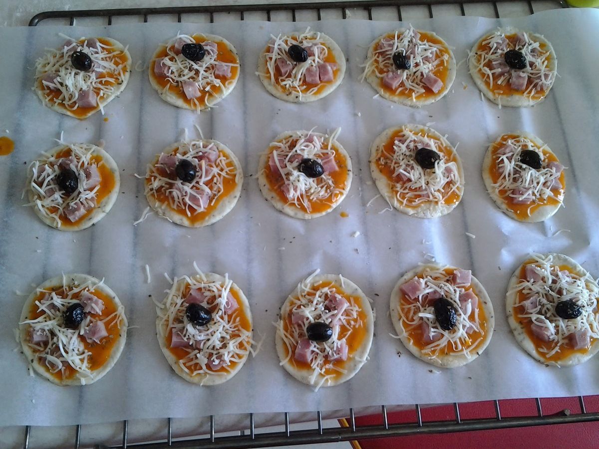 Étaler votre pâte et à l'aide d'un cercle découper des minis pizzas (photo 2). Les poser sur votre plaque de cuisson(photo3) et les badigeonner de sauce tomate.Puis par dessus les dés de jambon (photo4). Parsemer de gruyère râpè ainsi que de basilic puis poser une olive au centre de la pizza(photo5).