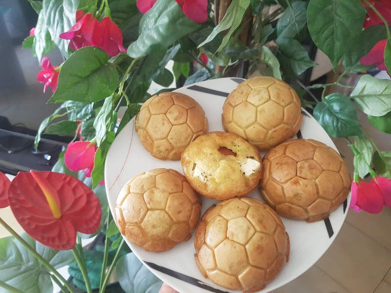 Emeline du blog Aussi Délice qu’un gâteau qui a réalisé mes cakes feta tomate cerise et courgette, elle a fait ce cake en version muffins ballon de foot. Merci Émeline
